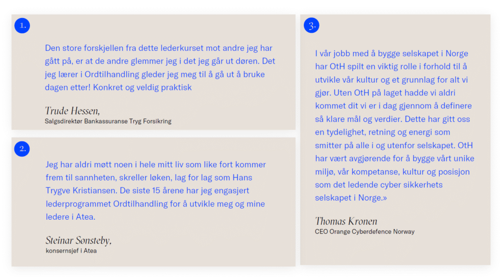 Gjennom vårt samarbeid med OtH har vi nå gleden av å tilby plass på deres lederprogram på Farris Bad som går over 10 mnd med seks to-dagerssamlinger. 25 ledere fra ulike selskap og bransjer, med praktisk oppfølging mellom samlingene. Neste program starter nå allerede 15. og 16. september, der de har fire plasser ledige (en kunde måtte utsette oppstart til neste program som starter i februar 2026) og vi kan tilby dette til 25% rabatt ved rask avgjørelse. Første mann til mølla prinsippet.